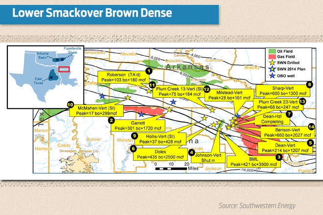 As of September, Southwestern was holding the rights to 396,000 net acres in the Brown Dense, down from almost 460,000 at the end of 2013.