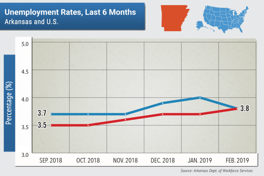 Arkansas’ unemployment rate in February was 3.8 percent, up one-tenth of a percentage point from the previous month.