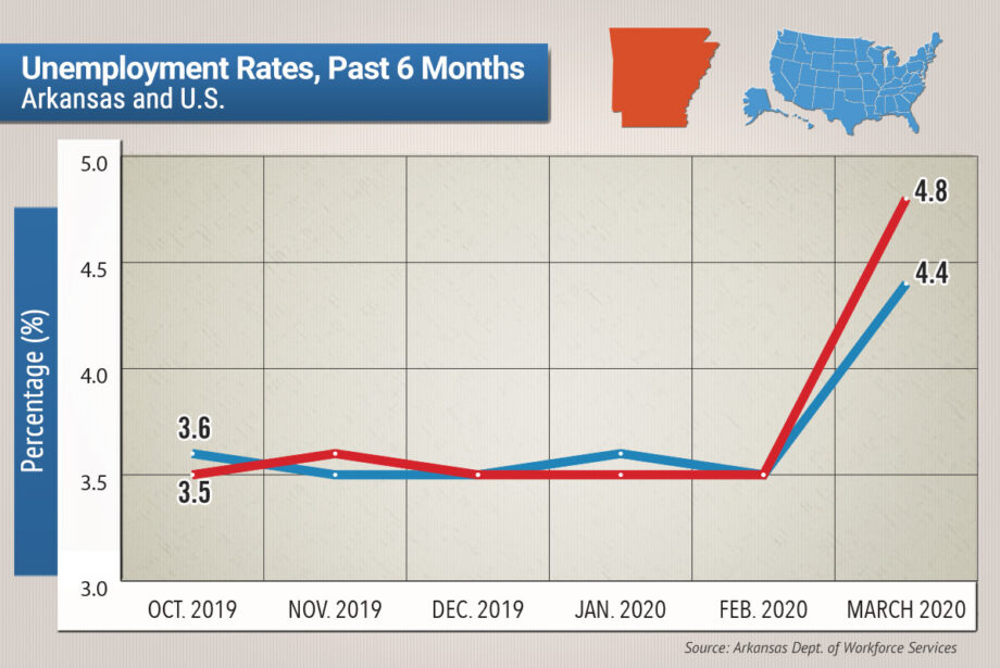 Arkansas’ unemployment rate rose one and three-tenths of a percentage point to 4.8% last month due to the COVID-19 pandemic, according to a report released Friday by the Arkansas Division of Workforce Services.