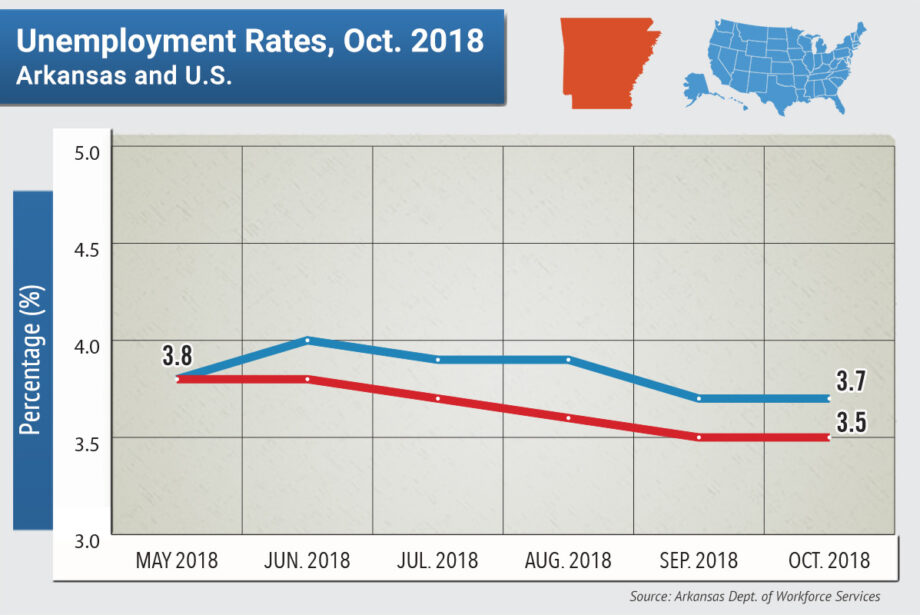 Arkansas’ unemployment rate was 3.5 percent in October and unchanged from the previous month, according to a report released Friday by the state Department of Workforce Services.