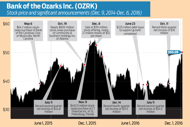 Bank of the Ozarks shares have followed a sometimes precipitous trek during the past few quarters. The pricing landscape traveled by the $18.5 billion-asset bank holding company is marked by several dramatic climbs and descents.