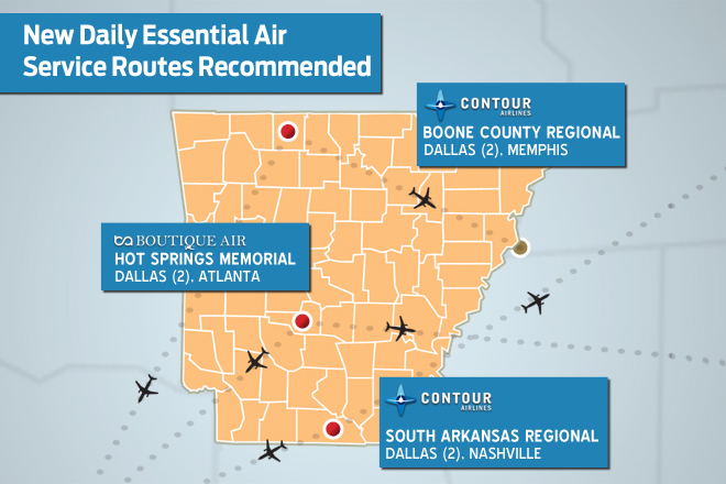 If their recommendations are approved, Contour will provide federally subsidized Essential Air Service (EAS) to the South Arkansas Regional Airport in El Dorado and Boone County Regional Airport in Harrison, while city-owned Hot Springs Memorial Field airport will receive EAS service from Boutique.