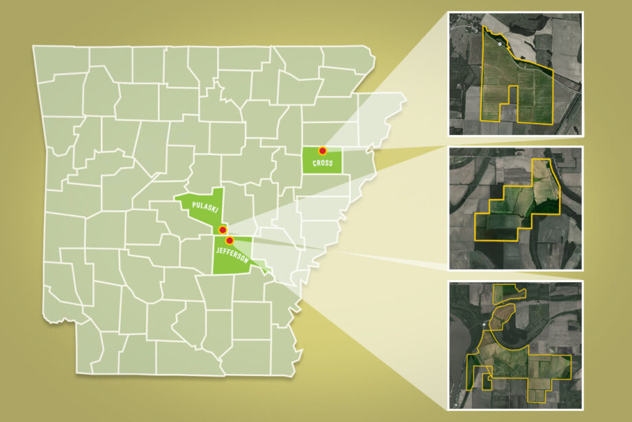 The transaction encompassed 1,322 acres in northern Jefferson County, a mile north of the Wright community, 780 acres 5 miles west of England in southeast Pulaski County and 543 acres in northern Cross County on the eastern edge of the Birdeye community.