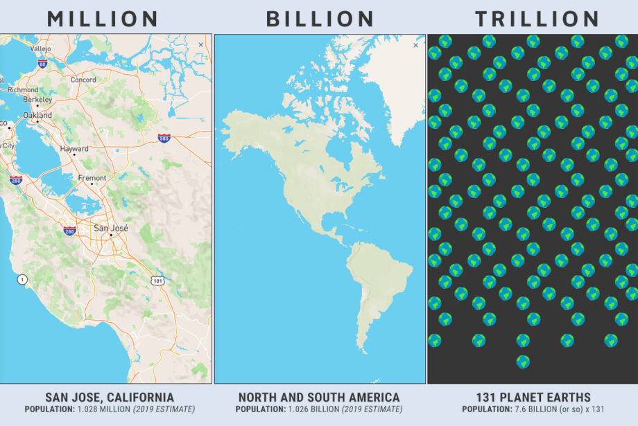 Billion, shmillion: A billion is a 1 followed by nine zeros. A billionaire? Piker! How ordinaire. Now, there are not yet any trillionaires on the planet — that’s a thousand times 1 billion, or a 1 followed by 12 zeros. Twelve zeros — now that’s something we can sink our teeth into. Or can we?