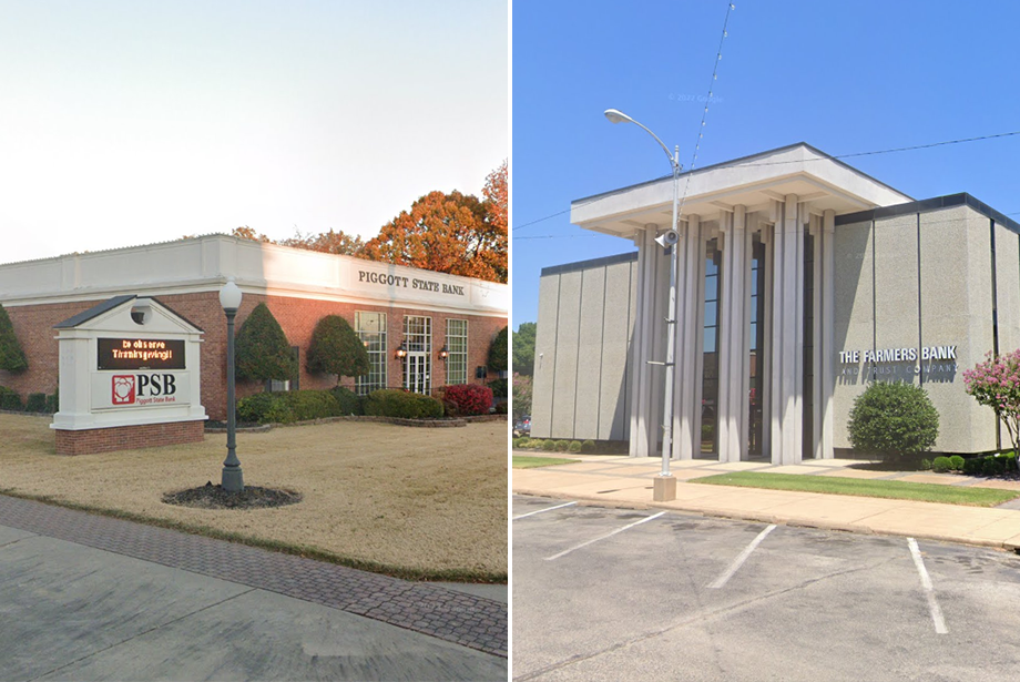 Farmers Bank & Trust reported $407.5 million in assets in the first quarter. Piggott State Bank reported $134.8 million in assets.