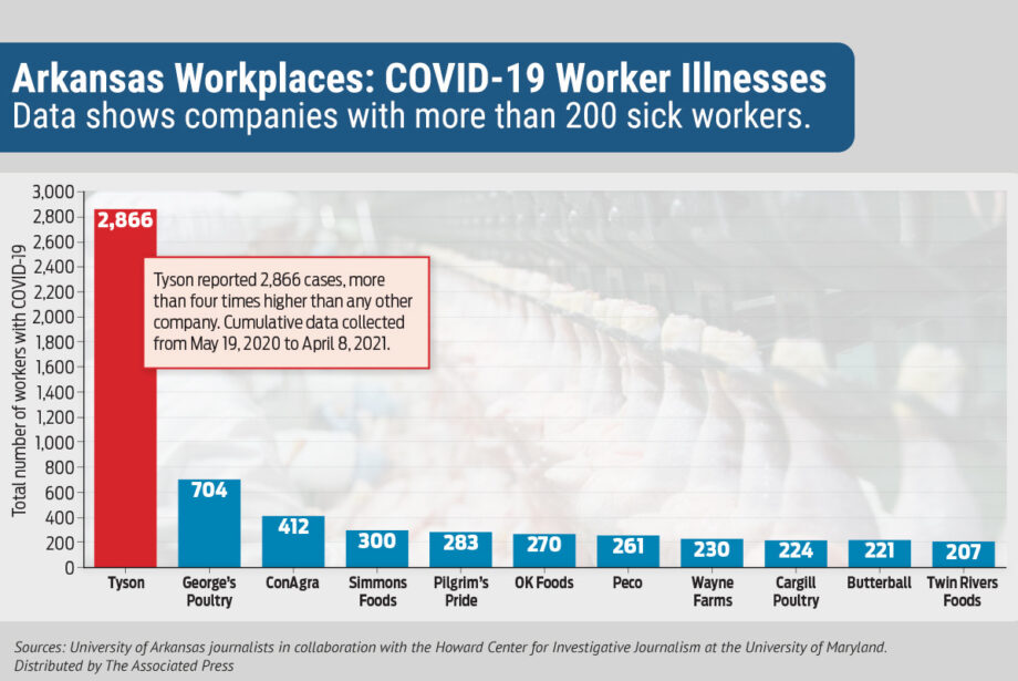 Tyson Foods Inc. of Springdale reported 2,866 COVID-19 cases at its workplaces, nearly one-third of the state’s 9,065 sickened workers across all industries from May 19, 2020, to April 8, 2021, according to an arkansascovid.com analysis of Arkansas Department of Health data.