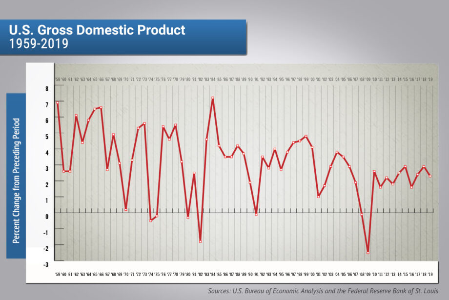 Real gross domestic product in the United States rose 2.3% in 2019, compared with an increase of 2.9% in 2018.