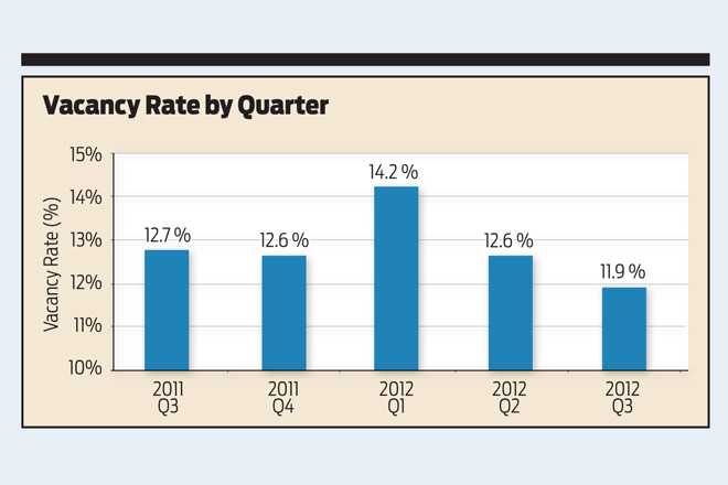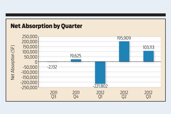 During third-quarter 2012, the office market in the Little Rock metro area saw positive absorption of 103,113 SF. This resulted in a decline in the vacancy rate to 11.9 percent, compared with 12.6 percent in second-quarter 2012 and 12.7 percent in third-quarter 2011.