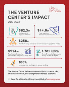 The Venture Center had an economic impact of $62.3 million in Arkansas from 2019 to 2023, according to a recent 62-page analysis released by Boyette Strategic Advisors of Little Rock.