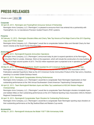 I searched my email inbox for some overlooked press release to no avail. Then I started Googling and, sure enough, found on Remington’s website a bare-bones announcement of the expansion, including a new building, that is to begin in the second quarter of 2013 and be in operation by the second quarter of 2014.
