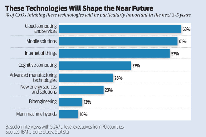 Most of them “believe cloud computing, mobile solutions and the Internet of Things (IoT) will predominate in the coming three to five years,” IBM said in its report, “Redefining Boundaries: Insights from the Global C-Suite Study.”