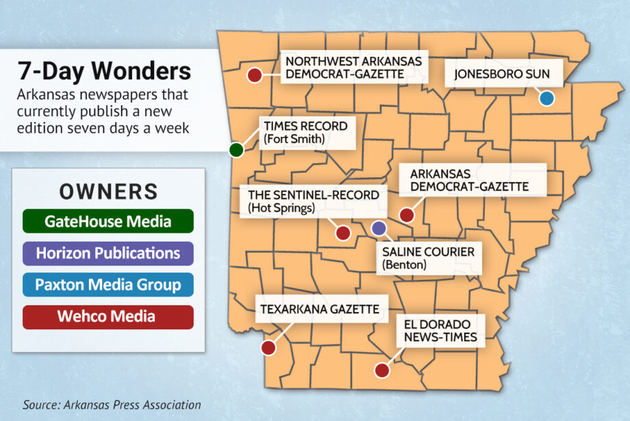 Eight still print all seven days, the APA replied. A decade ago, there were 15, according to the 2010 Arkansas Media Directory, published by the trade group.