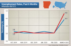 Arkansas' unemployment rate rose one and three-tenths of a percentage point to 4.8% last month due to the COVID-19 pandemic, according to a report released Friday by the Arkansas Division of Workforce Services. read more >